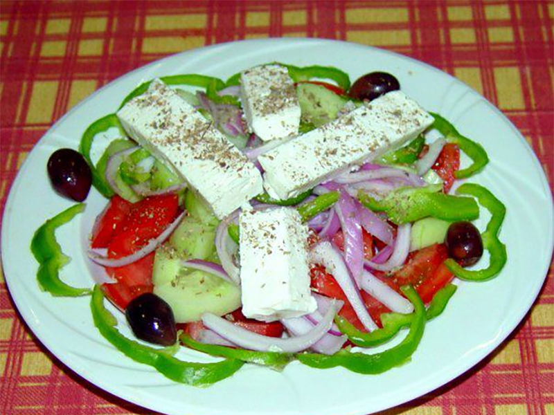 6,50€Σαλάτα με ντομάτα, αγγούρι, κρεμμύδι, πιπεριά, φέτα & ελιές