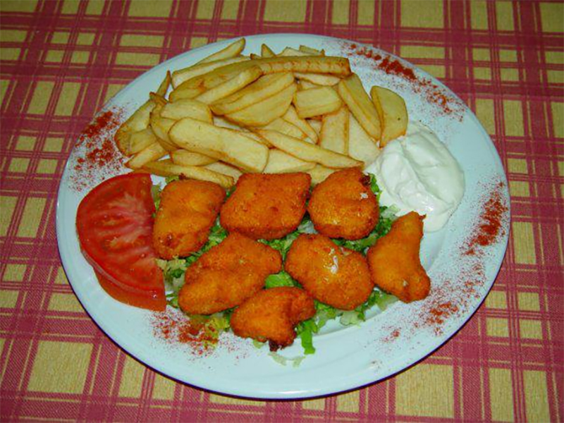 8,00€10 Τεμάχια. Συνοδεύεται από μαρούλι, ντομάτα, μαγιονέζα & πατάτες τηγανητές
