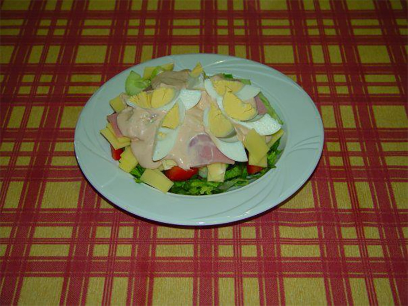 6,50€Σαλάτα με μαρούλι, ντομάτα, αγγούρι, αυγό, ζαμπόν, edam & sauce